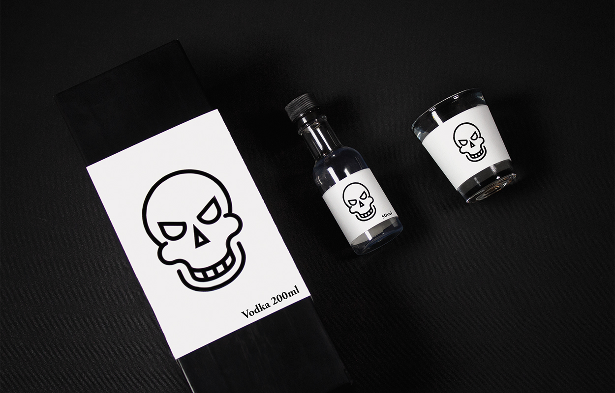 Emballage et étiquette d’un kit d’échantillon de vodka avec un thème de « Rock n’ Roll ».